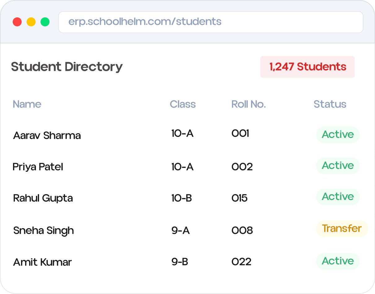 Online admission forms, document collection, and enrollment workflows. Track applications from inquiry to admission.